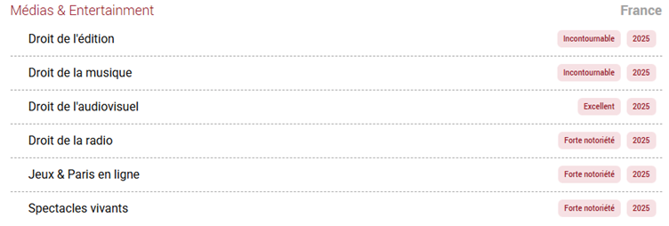 Classement du cabinet par Décideurs-Leaders League en « Médias & Entertainment » dans les catégories suivantes :